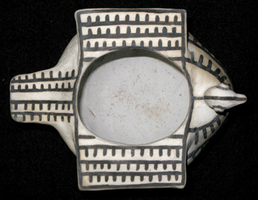 This very interesting flying bird effigy offers a lot of impact for its size. Beautiful satin to warm white body with jet black paint. A wonderful display piece.