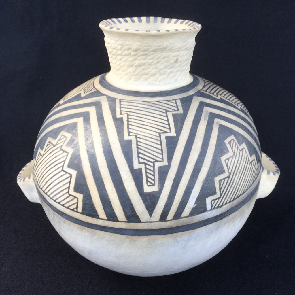 High quality, well fired olla with great personality. Satin grey to warm white in body color with rich black paint. This piece has a corrugated neck which was rare during Pueblo III times. Fired in Bluff, Utah in 2018.