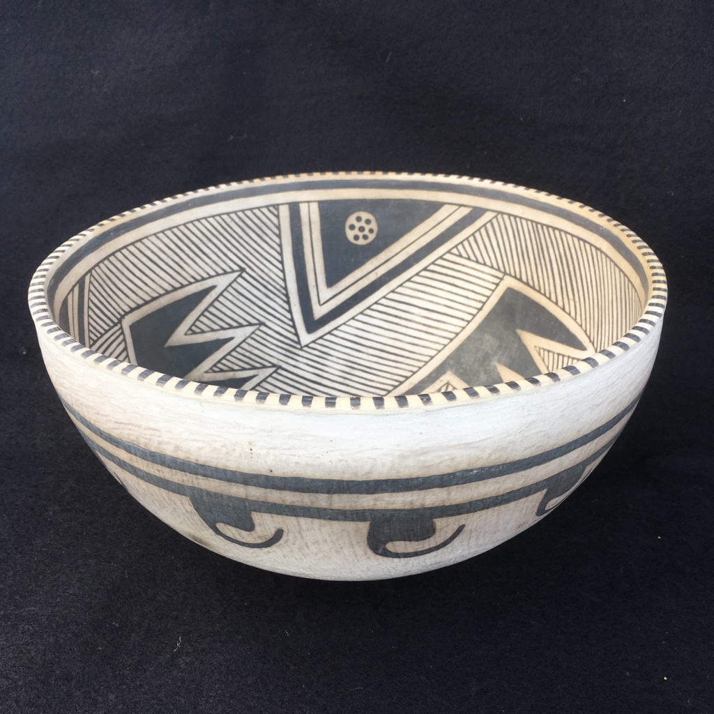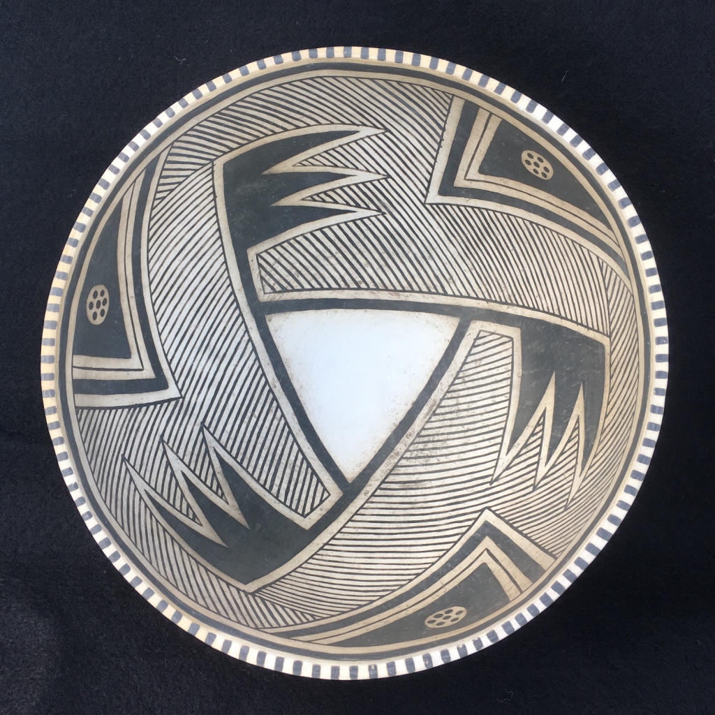 High quality larger bowl with detailed design inside and talon band painted around the exterior. Lightly oxidized in areas show an interesting interaction with fire. Includes juniper bark pot rest (not shown).