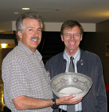 Dr. Ian Hodder director of the Stanford University Archaeology Center receives a Mesa Verde replica bowl from Gregory Wood in May 2009.